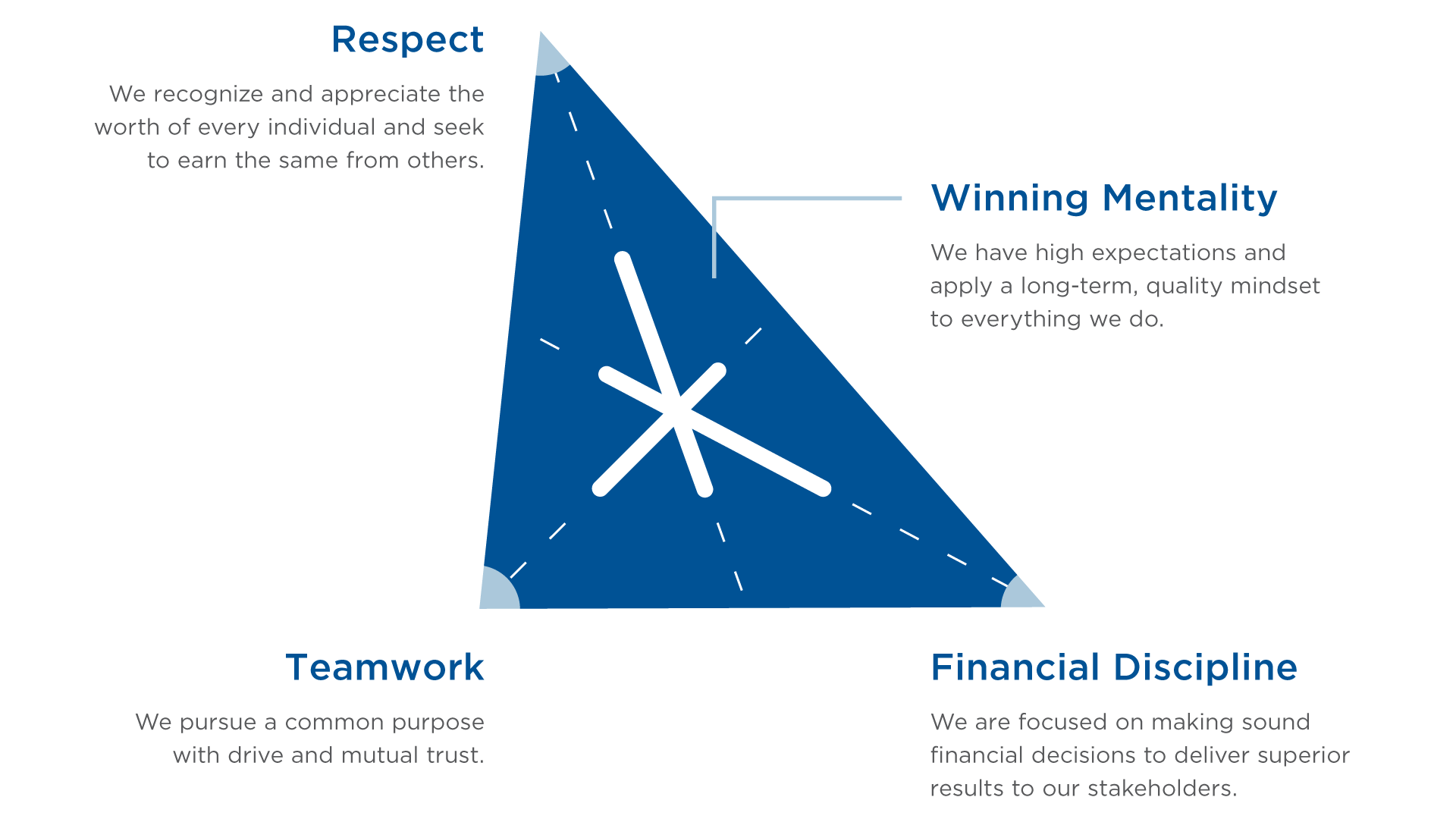 Our logo is based on a centuries-old principle describing the physics of a sail. Where three bisecting lines of a triangular sail meet is known as the Center of Effort, the point at which the propelling force of the wind is greatest. Respect, Teamwork, Financial Discipline, and Winning Mentality are the values that drive our culture and success.